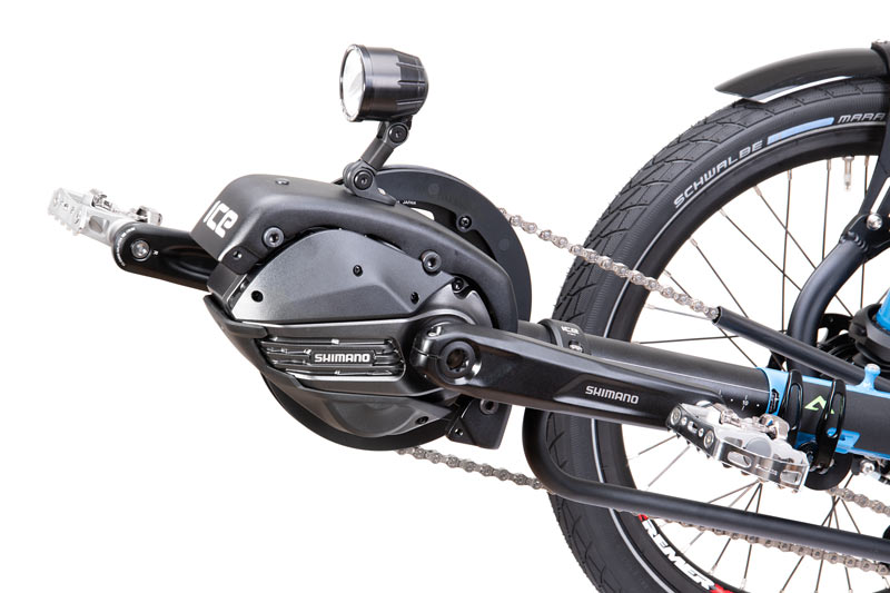 Natürlich lässt sich unser ICE Adventure Liegedreirad auf Wunsch auch mit modernen E-Antriebssystem ausstatten. Um die maximale Unterstützung und Reichweite zu ermöglichen bieten wir den aus dem MTB Bereich stammenden Shimano Steps EP8 E-Antrieb an.